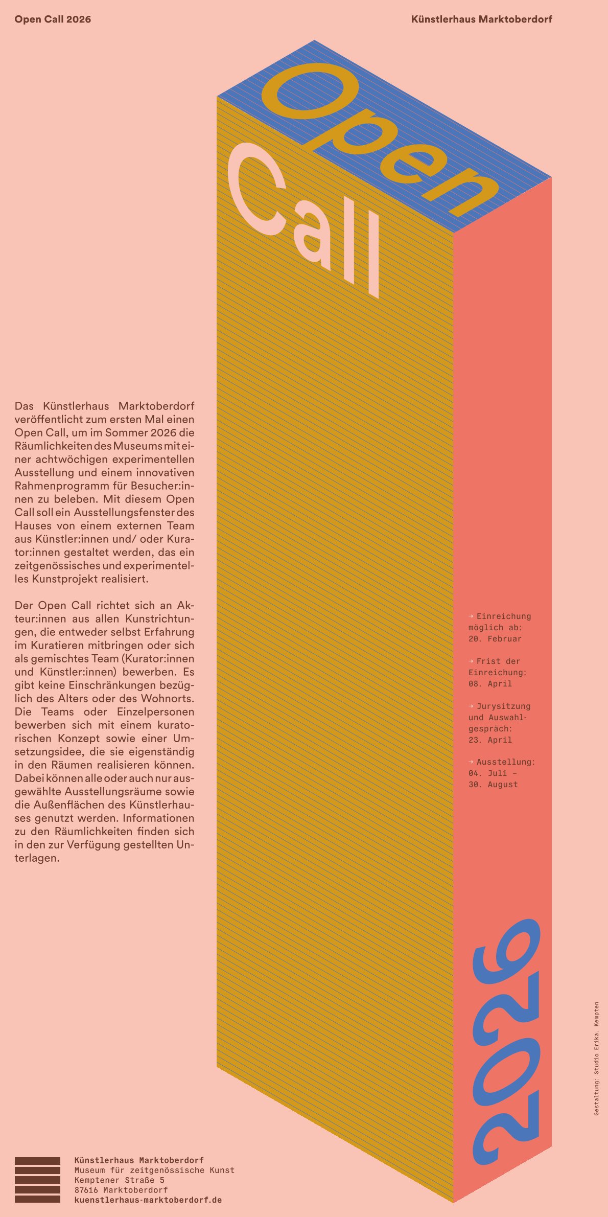 Das Künstlerhaus Marktoberdorf veröffentlicht zum ersten Mal einen Open Call, um im Sommer 2026 die Räumlichkeiten des Museums mit einer achtwöchigen experimentellen Ausstellung und einem innovativen Rahmenprogramm für Besucher:innen zu beleben. Mit diesem Open Call soll ein Ausstellungsfenster des Hauses von einem externen Team aus Künstler:innen und/ oder Kurator:innen gestaltet werden, das ein zeitgenössisches und experimentelles Kunstprojekt realisiert.